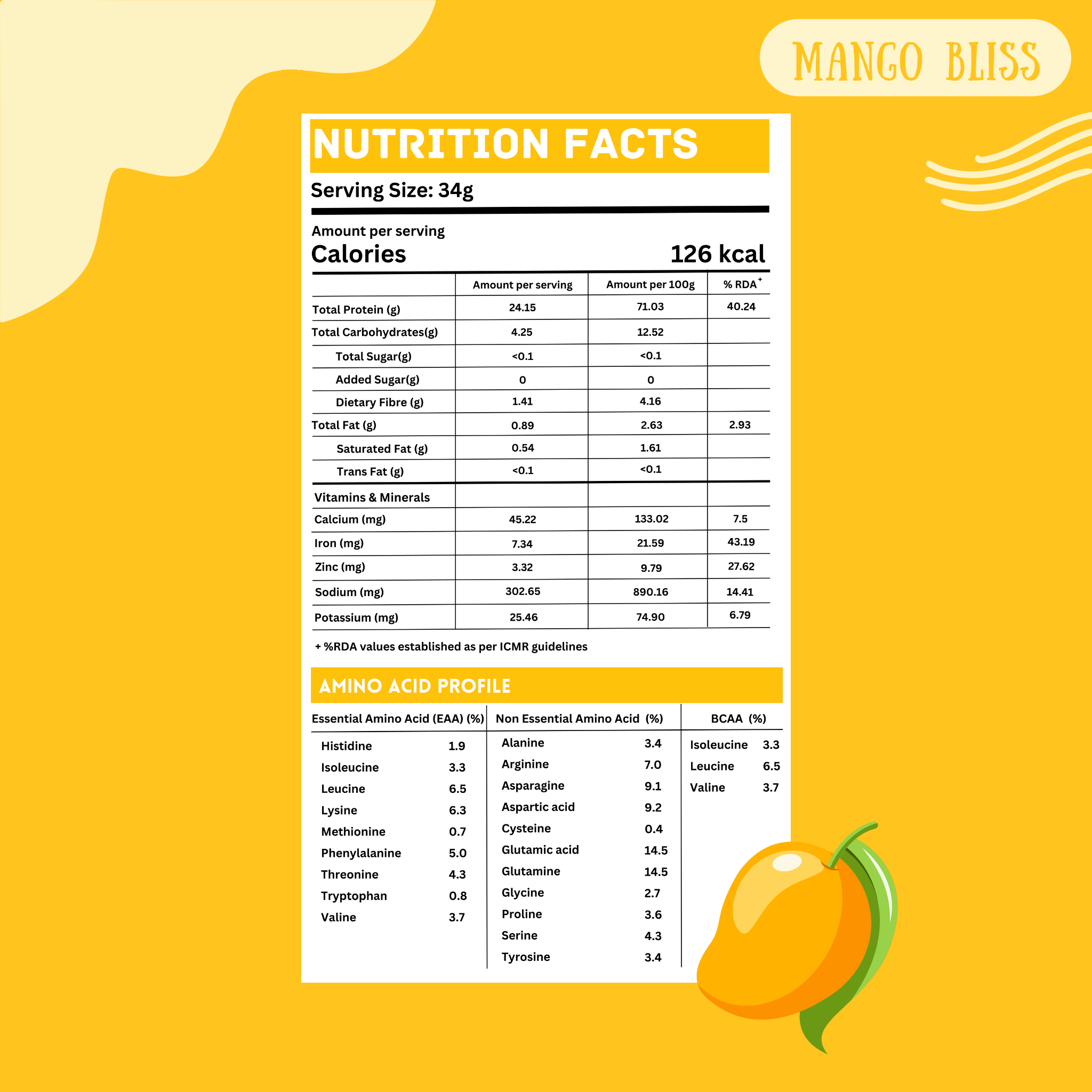 Introducing ‘Mango Bliss,’ the epitome of tropical delight in every scoop. Immerse yourself in the luscious fusion of ripe, sun-kissed mangoes, and the velvety richness of our WishFit Plant Protein. This irresistibly creamy blend not only tantalizes your taste buds but also nourishes your body with a burst of plant-powered goodness. Evolve your fitness/ wellness experience with Mango Bliss – where taste meets nutritious for a truly blissful treat! – it contains no preservatives and is sweetened only with Stevia (natural sweetener), ensuring a sugar-free, guilt-free indulgence.